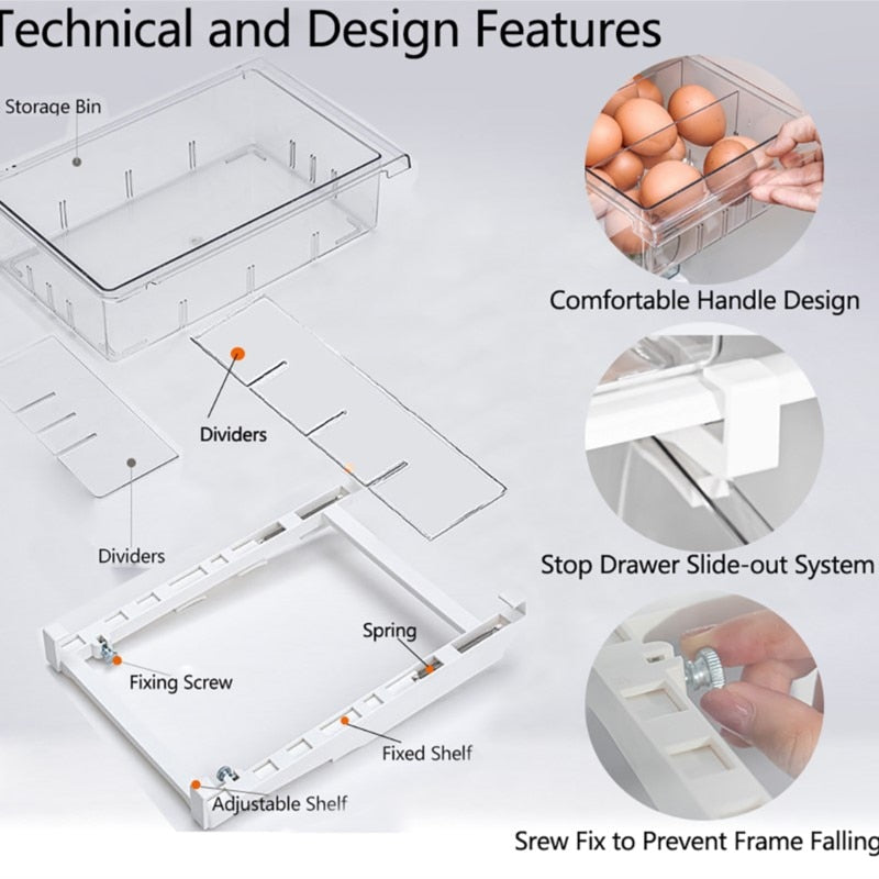 Super easy! No tools or drilling required. Simply slide and clip it onto any standard fridge shelf. The smooth-gliding drawer lets you reach your food effortlessly while keeping everything tidy.